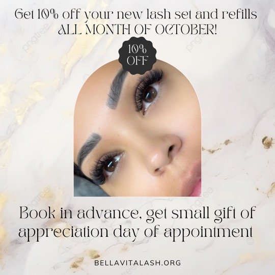 Don't miss out on this exclusive offer! Enjoy a 10% OFF on all new lash sets and refills throughout October. That's right—it's the perfect time to enhance your natural beauty for less. Treat yourself to a luxurious experience and get the stunning lashes you've always dreamed of without breaking the bank.